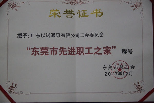 2018年1月12日,东莞市总工会向开云手机入口 - 开云中国二级控股子公司广东以诺通讯有限公司工会颁发“东莞市先进职工之家”称号的证书及牌匾。以诺通讯工会充分发挥桥梁纽带作用,团结凝聚广大职工,推进企业发展。圆满完成了工会换届选举,定期召开工会会员代表座谈会,先后组织开展了《工会法》《劳动法》《劳动合同法》等法律法规讲座,协办东莞市大朗镇首届“迎新杯”企业足球赛等文体活动,作为基层工会优秀代表,应邀参加了2018年东莞市困难职工帮扶工作座谈会并作典型发言。