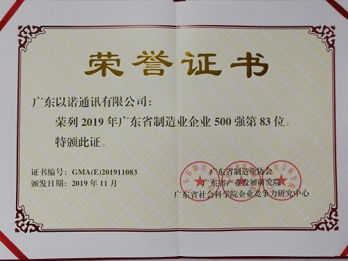 2019年11月13日,由广东省制造业协会、广东省产业发展研究院、广东省社会科学院企业竞争力研究中心共同主办的2019广东省制造业发展年会暨广东制造业500强企业峰会在广州隆重举行,会上发布了2019年广东省制造业500强企业研究报告,开云手机入口 - 开云中国二级控股子公司广东以诺通讯有限公司荣列2019年广东省制造业企业500强第83位。