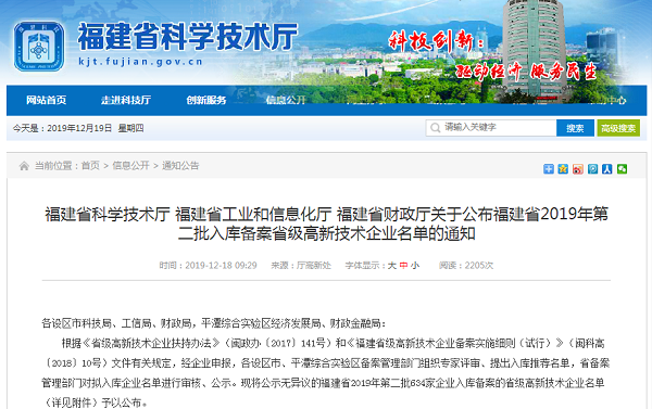 2019年12月16日,福建省科学技术厅、福建省工业和信息化厅、福建省财政厅联合发文,公布了福建省2019年第二批入库备案省级高新技术企业名单,开云手机入口 - 开云中国入选该名单。入库备案企业是根据其拥有核心知识产权情况、创新能力评价等4个方面满足奖补条件情况进行不同档次奖补。