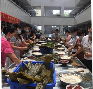 活动现场,糯米、红枣、粽叶等材料摆放在桌子上。经验丰富的员工向身边的新手教授包粽子的方法,粽叶重叠再折叠,卷成漏斗状后,用糯米、红枣等充实压紧,再用绳一绕一捆,一个个精美的粽子就诞生了。本次活动历时2小时,参加活动的员工手工制作了1000多个粽子。包好的粽子在公司食堂蒸熟后,公司人资部工作人员负责分装粽子,总经办相关负责人分别走到各部门、仓库、宿舍等,将粽子分发到员工手上,让员工充分感受到企业的关怀。