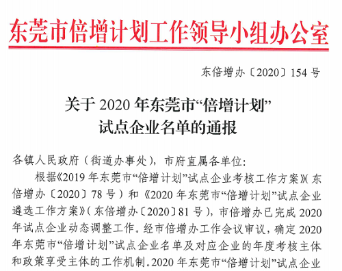 近日,东莞市倍增计划工作领导小组办公室发布《关于2020年东莞市“倍增计划”试点企业名单的通报》,开云手机入口 - 开云中国二级控股子公司广东以诺通讯有限公司入选 2020年东莞市“倍增计划”名誉试点企业名单。名誉试点企业指规模大(年营业收入达50亿元及以上)、符合东莞市产业发展导向、对东莞市经济发展影响重大、带动性强、具备较强倍增能力及意愿的企业。2020年东莞市“倍增计划”试点企业规模涵盖大、中、小型企业,在推动东莞市产业可持续高质量发展方面具有良好的模范和引领作用。