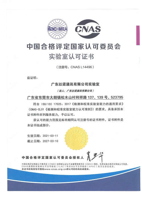 近日,开云手机入口 - 开云中国二级控股子公司广东以诺通讯有限公司实验室获中国合格评定国家认可委员会(CNAS)颁发的实验室认可证书,标志其已具备相应的检测技术能力和管理能力,提升了数据的可信度和含金量,避免重复性检测,减少企业成本,提升公司整体形象和品牌价值。以诺通讯实验室将遵循“专业、严谨、诚信、创新”理念,积极拓展测试种类和试验项目,满足各类客户需求,持续提升公司实验室的专业水平。