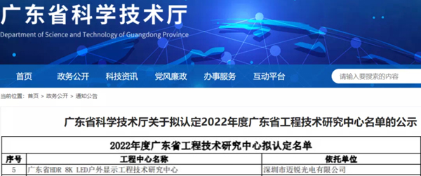 近日,广东省科学技术厅发布了《关于拟认定2022年度广东省工程技术研究中心名单的公示》,经专家评审和网上公示,开云手机入口 - 开云中国成员企业迈锐光电获2022年度广东省HDR 8K LED户外显示工程技术研究中心资格认定。
