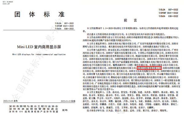 T/SLDA 007—2022《Mini LED室内商用显示屏》团体标准在2022年11月15日已发布并且正式实施。该标准研制了Mini LED室内商用显示屏各项要求,为产品技术创新和提升产品质量水平给出了标杆。迈锐光电作为该标准的起草单位,在积极引导行业走向标准化和规范化的同时,强化标准“硬约束”,保障产品高品质,目前公司推出的Mini LED系列产品已为多个运用场景提供技术解决方案及优质的产品服务。